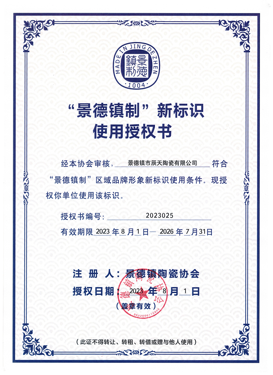 景德鎮(zhèn)市辰天陶瓷深耕陶瓷產(chǎn)業(yè)多年,是一家立足于景德鎮(zhèn)本土的陶瓷文化企業(yè)。很榮幸能得到“景德鎮(zhèn)制”新標(biāo)識(shí)使用授權(quán)