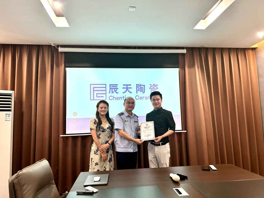 2023年8月25日下午,由景德鎮(zhèn)市市場(chǎng)監(jiān)督管理局副局長(zhǎng)、陶瓷協(xié)會(huì)秘書長(zhǎng)林春杰頒發(fā)授予《“景德鎮(zhèn)制”新標(biāo)識(shí)使用授權(quán)書》送至景德鎮(zhèn)市辰天陶瓷董事長(zhǎng)高劍偉